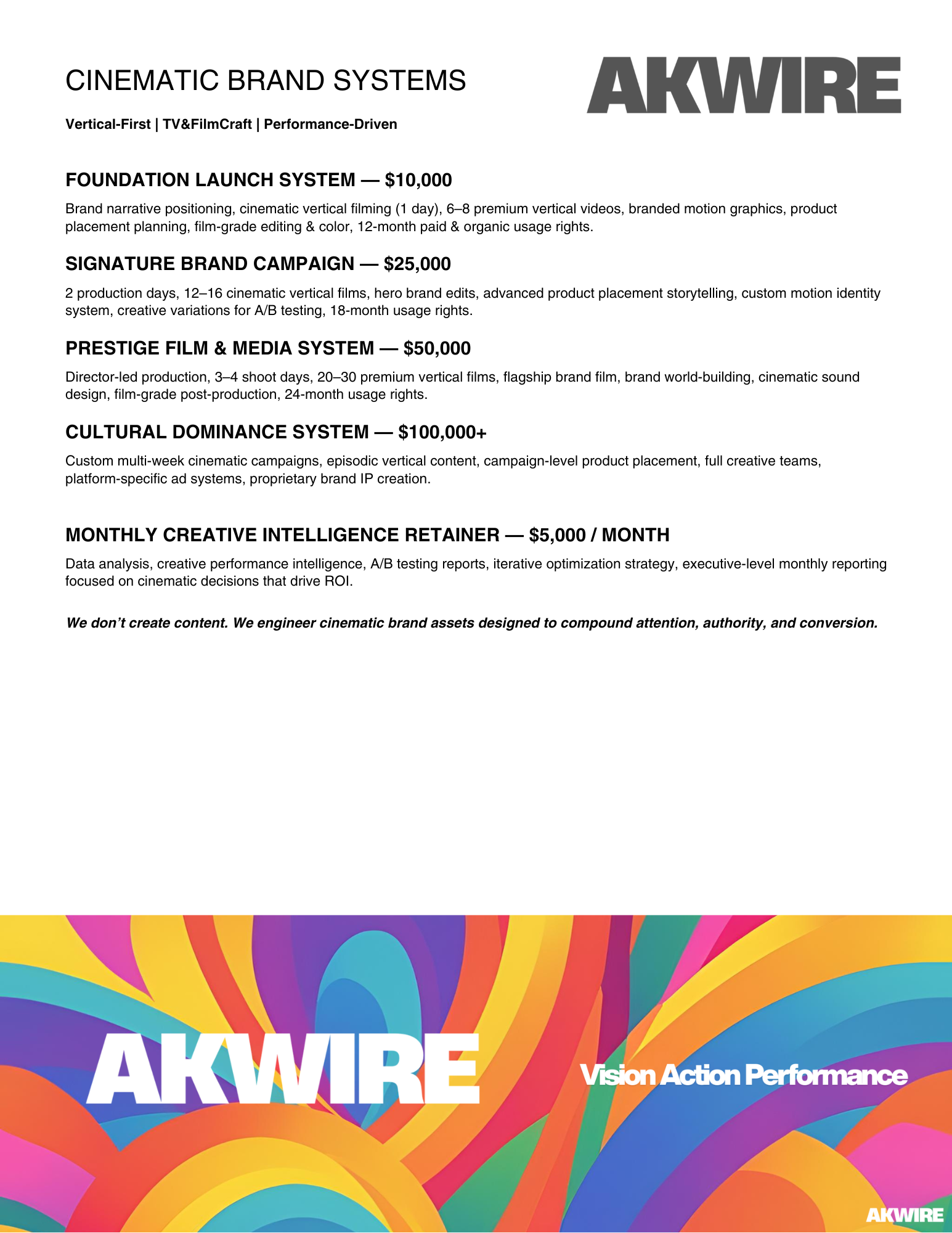 We engineer cinematic brand assets designed for attention, conversion, and cultural relevance optimized for vertical platforms and premium media environments.